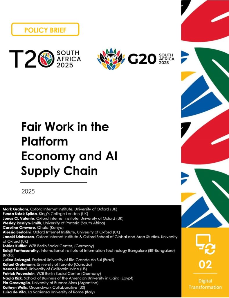Research has provided strong evidence of how digital labour platforms and artificial intelligence (AI) are shaping the future of work. The International Labor Organization counted an increase in digital labour platforms from 142 to 777 in the decade of 2010–2020. Platform work is a source of livelihood for millions of workers worldwide; AI has also been seen as a transformative technology capable of boosting productivity and improving the labour process in a wide variety of economic sectors. But neither is without concerns. Digital labour platforms can facilitate precarious arrangements with low and insecure pay, poor and unsafe working conditions, inaccessible and unreasonable contracts, unfair and non-transparent management systems, and a lack of representation. AI at work also brings a risk of job displacement and the demand for new skills. These subjects have been part of G20 agendas related to sustainable growth, employment, and the digital economy. This policy brief presents specific and actionable recommendations drawn from evidence gathered over five years by the Fairwork project. The project evaluates fairness in digital labour platforms and the AI supply chain, and engages with companies, workers, and policymakers. The policy brief addresses critical topics linked to SDG 8: “Employment, decent work for all, and social protection”. The proposal lists recommendations to promote a more inclusive and equal digital transformation in labour relations and processes in digital labour platforms and the AI supply chain, covering challenges related to pay, conditions, contracts, management (including equity and inclusion), and representation.