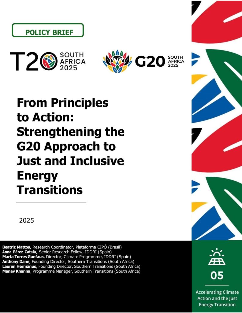 Building on previous G20 initiatives and relevant developments within other multilateral forums, this policy brief presents recommendations to strengthen and refine the G20’s just transition principles, aiming to enhance its outcomes. It offers insights on how they can be strengthened to effectively promote energy transitions that align climate goals with improved socio-economic outcomes, both within the G20 and globally. By clarifying just transition principles and proposing actionable political strategies to embed these principles in national and global policies and frameworks, the brief seeks to further elevate the G20 leadership on just transition, as well as inform other key actors and processes, notably the UNFCCC and the Brazilian COP30 presidency.