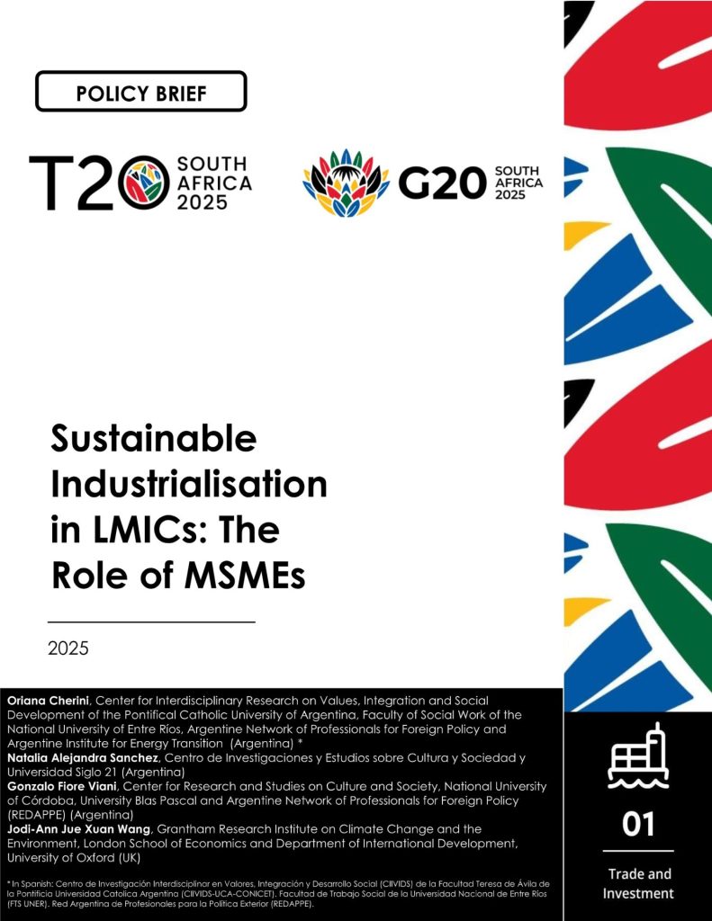 The brief advocates for three main support mechanisms from a territorial, sustainable, multistakeholder, and multilevel perspective: 1) microcredit and green investment funds; 2) international and regional alliances to promote sustainable global and regional value chains; and 3) the promotion of local public policies for sustainable business management. It also highlights the need for the G20 as a key space for multilateral cooperation for the coordination of public–private policies that strengthen inclusive and sustainable governance. In this context, the Investment Facilitation for Development Agreement offers a strong institutional framework to organise and align efforts, enhancing collaboration and ensuring effective implementation. This approach aims to shift the conventional framework of international economic cooperation, which is based on a state-centric and public-centric model, towards a bottom-up strategy that emphasises sustainable industrialisation tailored to the unique needs of each region worldwide. The goal is to harness the G20’s influence to promote inclusive investment for sustainable industrialisation from a multicentric and comprehensive standpoint, engaging the efforts of diverse stakeholders.